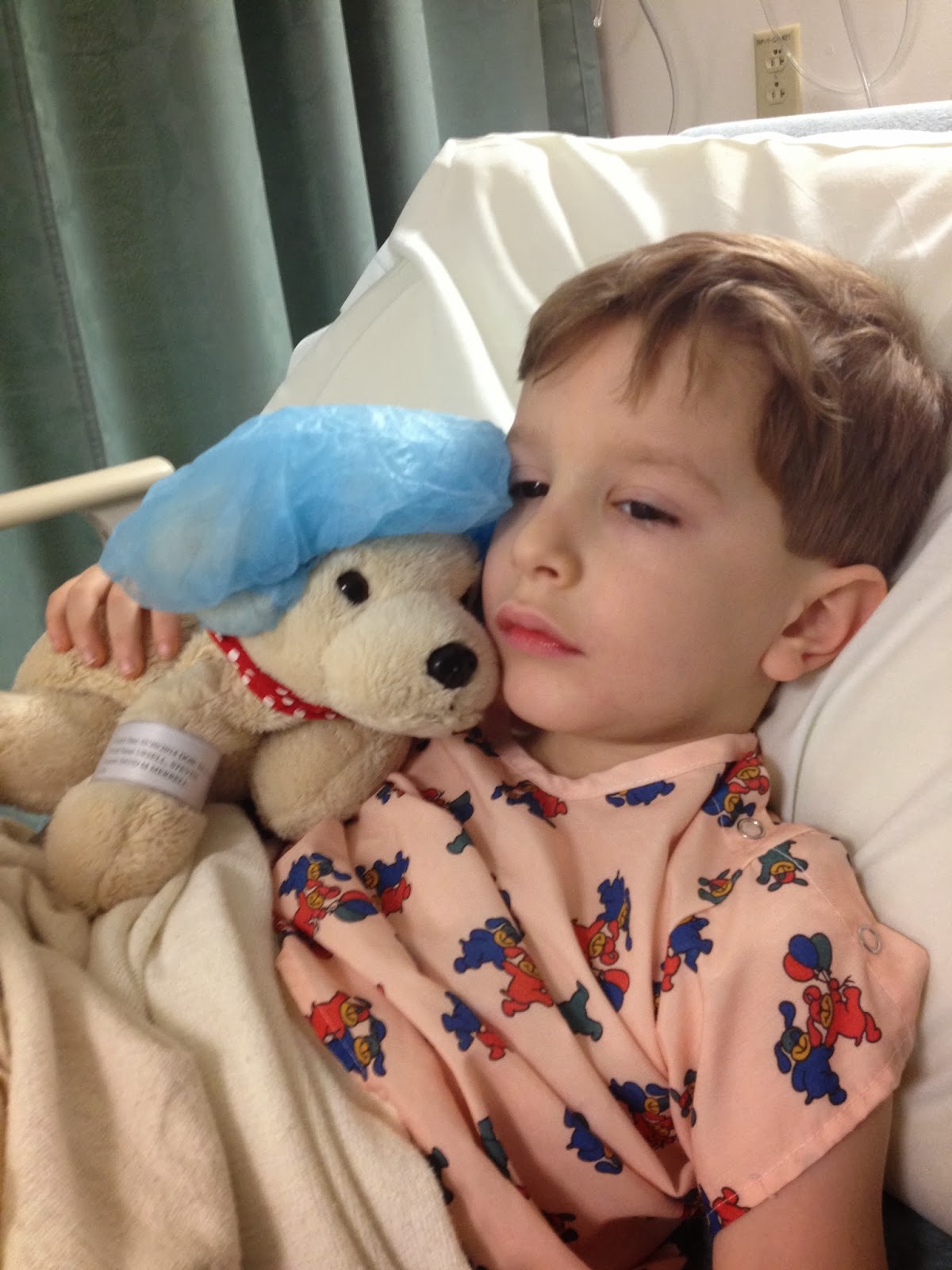 He brought his favorite puppy with him, and when we were checking in, they even gave puppy a wrist band.  He hated having to put on the hospital pajamas, and when they said he couldn’t wear his underwear, just incase he had an accident, he asked if he had to wear a baby diaper (so cute).